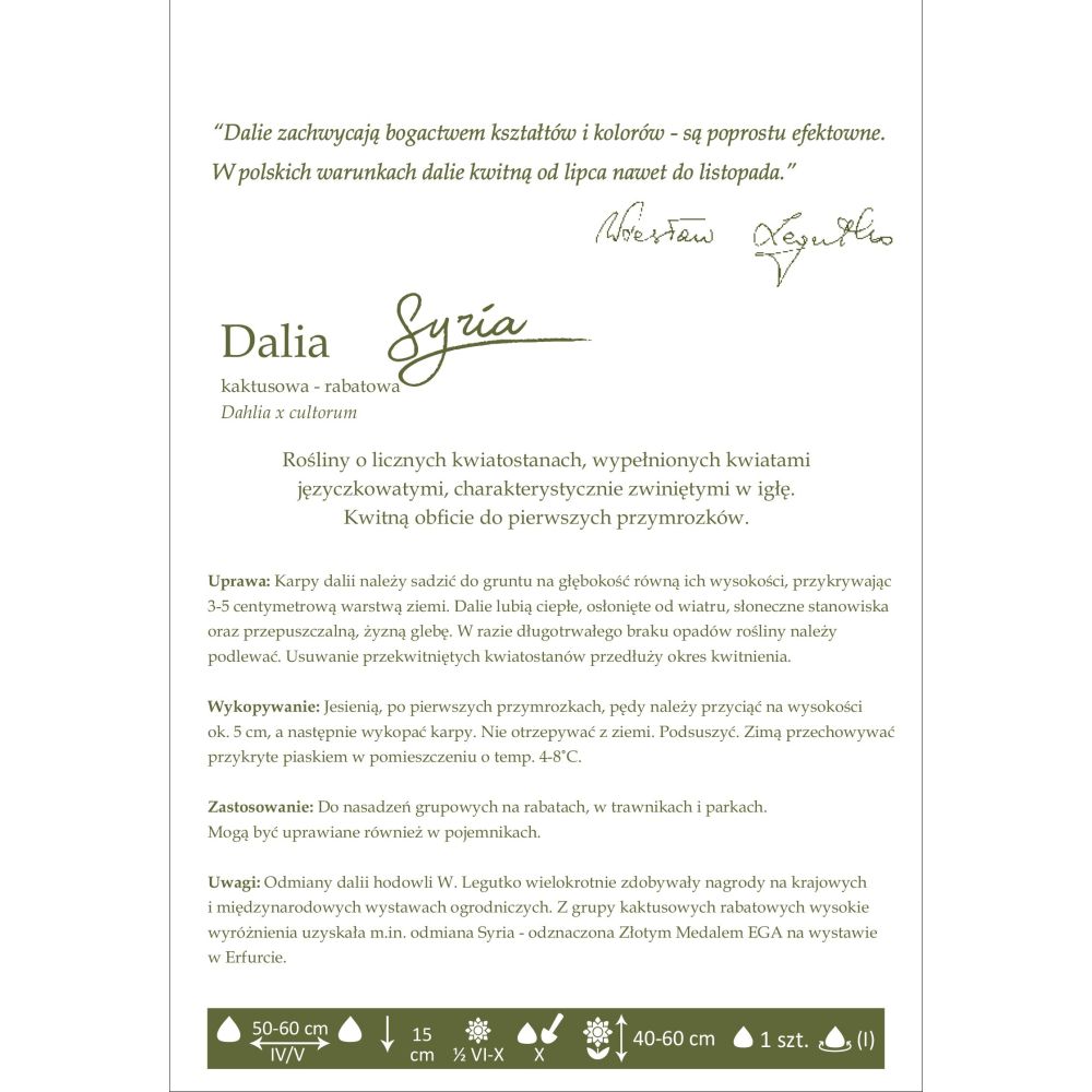 Komentář: Odrůdy jiřin vyšlechtěné W. Legutkem opakovaně získaly ocenění na národních i mezinárodních zahradnických výstavách. Ze skupiny podestýlkových kaktusů získala vysoká ocenění mj. Odrůda Syria - oceněná zlatou medailí EGA na výstavě v Erfurtu.