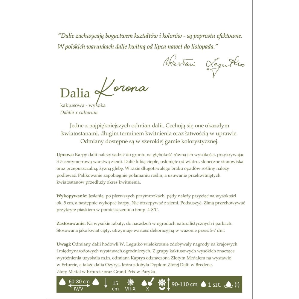 Komentář: Odrůdy jiřin vyšlechtěné W. Legutkem opakovaně získaly ocenění na národních i mezinárodních zahradnických výstavách. Ze skupiny vysokých kaktusů byla udělena významná ocenění mj. odrůda Kaprys oceněná Zlatou medailí na výstavě v Erfurtu, dále jiřinka Osirys, která získala Zlatý jiřinkový diplom v Bredene, Zlatou medaili v Erfurtu a Grand Prix v Paříži.