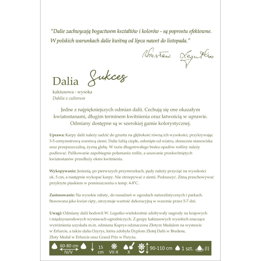 Komentář: Odrůdy jiřin vyšlechtěné W. Legutkem opakovaně získaly ocenění na národních i mezinárodních zahradnických výstavách. Ze skupiny podestýlkových kaktusů získala vysoká ocenění mj. Odrůda Syria - oceněná zlatou medailí EGA na výstavě v Erfurtu.