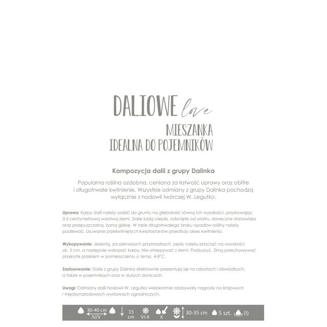 Oblíbená okrasná rostlina, ceněná pro snadné pěstování a bohaté a dlouhotrvající kvetení. Všechny odrůdy ze skupiny Dalinka pocházejí výhradně z kreativní šlechtitelské farmy W.Legutka.