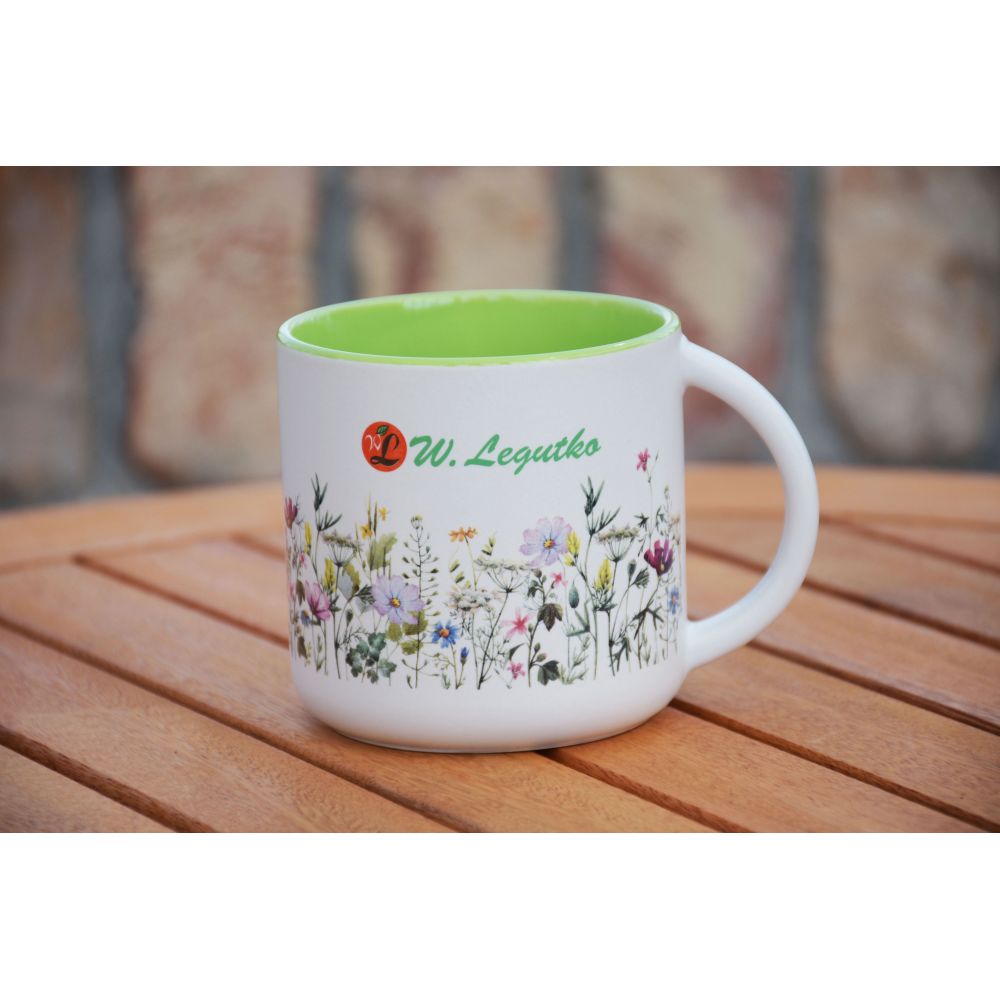 Hrnek s grafikou znázorňující květinovou louku, vyrobený z bílé, matné keramiky z vnější strany a lesklého zeleného vnitřku. Má rovné, válcové stěny a jedinečný tvar rukojeti. Hrnek s velmi velkou kapacitou, určený pro milovníky přírody. Díky svému šarmu se hodí jako dárek.