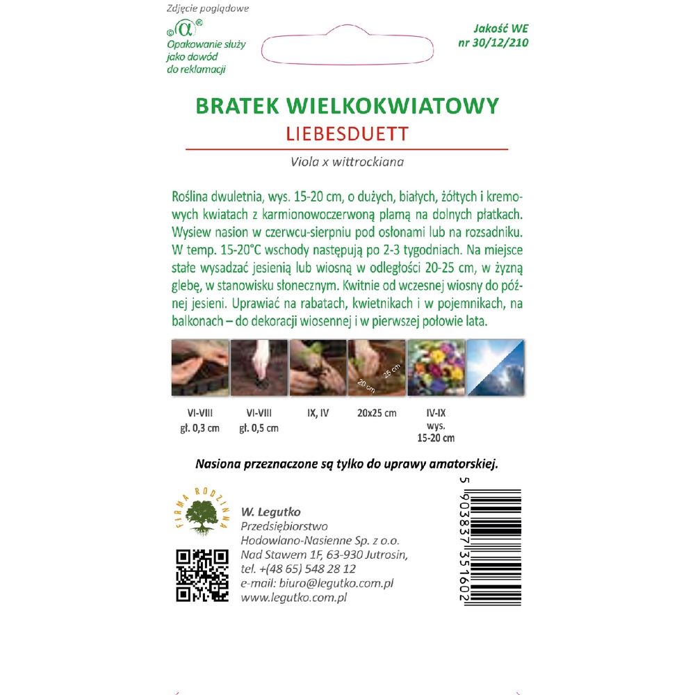 Dvouletá rostlina, výška 15-20 cm, velké bílé, žluté a krémové květy s karmínově červenou skvrnou. Výsev semen v červnu až srpnu pod krytem nebo na seťovém lůžku. Při teplotách 15-20°C dochází ke vzcházení po 2-3 týdnech. Vysazujte na podzim nebo na jaře ve vzdálenosti 20-25 cm, do úrodné půdy, na slunné stanoviště. Kvete od časného jara do pozdního podzimu. Pěstujte na záhonech, záhonech, v nádobách, na balkonech - pro jarní a pololetní dekoraci.