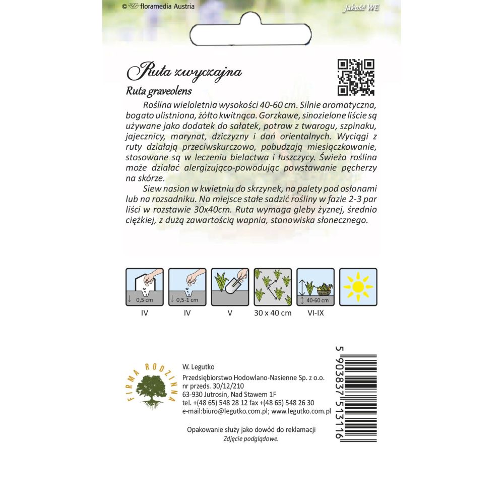 Silně aromatická, bohatě olistěná, žlutě kvetoucí trvalka, 40-60 cm vysoká, Hořké, modrozelené listy se používají jako doplněk do salátů a orientálních jídel. výtažky z ruty mají protikřečové vlastnosti, stimulují menstruaci a používají se k léčbě vitiliga a psoriázy. Čerstvá rostlina může být alergická a způsobit puchýře na kůži. Semena vysévejte v dubnu do krabic, na palety pod kryty nebo na seťové lůžko. Na trvalé stanoviště vysazujte rostliny ve fázi 2-3 párů listů v rozestupu 30x40 cm. Rue vyžaduje úrodnou, středně těžkou půdu s vysokým obsahem vápníku a slunnou polohu.