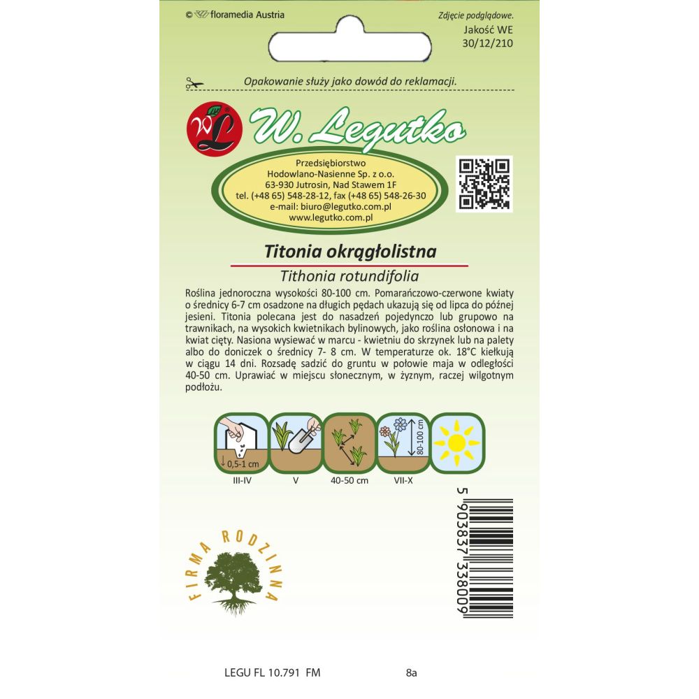 Jednoletá rostlina, výška 80-100 cm. Oranžově červené květy o průměru 6-7 cm, nasazené na dlouhých výhoncích, se objevují od července do pozdního podzimu. Titonia se doporučuje vysazovat jednotlivě nebo ve skupinách na trávníky, do vysokých trvalkových záhonů, jako pokryvná rostlina i jako řezaná květina. Semena vysévejte v březnu až dubnu do krabic nebo na palety nebo do květináčů o průměru 7-8 cm. Při 18°C vyklíčí do 14 dnů. Sazenice zasaďte do země v polovině května na vzdálenost 40-50 cm. Pěstujte na slunném místě, v úrodné, spíše vlhké půdě.