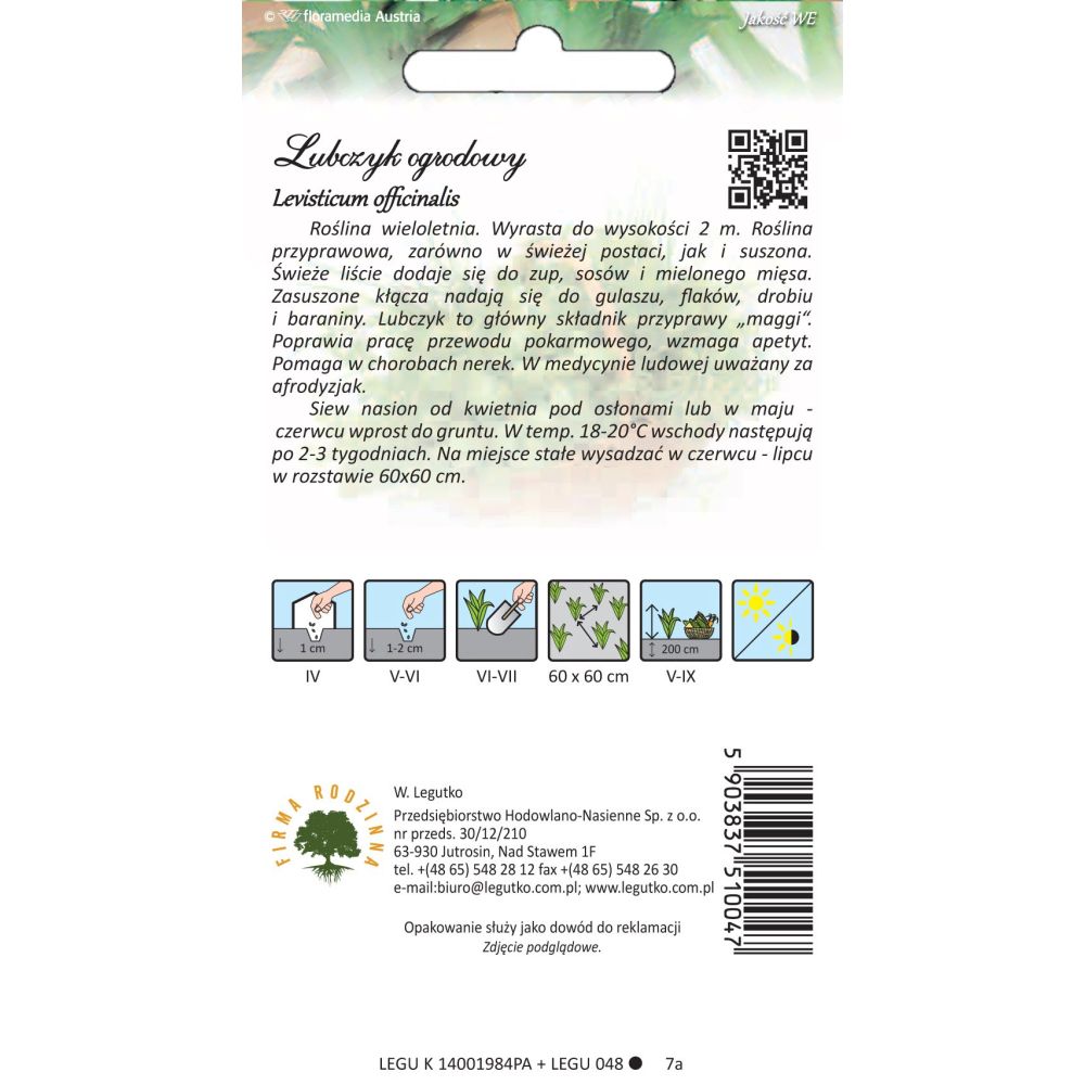 Vytrvalá rostlina. Dorůstá do výšky 2 m. Rostlina koření, čerstvá i sušená. Čerstvé listy se přidávají do polévek, omáček a mletého masa. Sušené oddenky jsou vhodné do gulášů, dršťků, drůbeže a skopového masa. Kromě toho zlepšuje činnost trávicího traktu a zvyšuje chuť k jídlu. Výsev semen od dubna pod krytem nebo v květnu až červnu přímo do země. Při teplotách 18-20°C dochází ke vzcházení po 2-3 týdnech. Vysazujte na trvalé stanoviště v červnu až červenci ve vzdálenosti 60x60 cm.