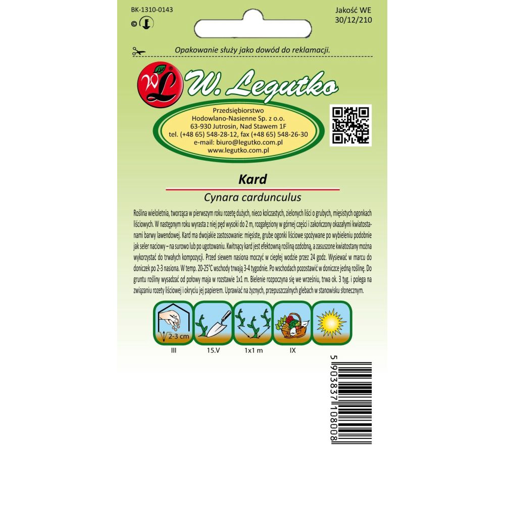 Vytrvalá rostlina, v prvním roce tvoří růžici velkých, mírně ostnitých, zelených listů se silnými dužnatými řapíky. V příštím roce vyroste do výhonu vysokého až 2 m, v horní části rozvětveného a zakončeného efektními levandulovými květenstvími. Srdeční má dvojí využití: dužnaté tlusté řapíky se konzumují po vybělení, podobně jako celer – syrové nebo vařené. Kvetoucí kardon je atraktivní okrasná rostlina a sušená květenství lze použít pro dlouhodobé kompozice. Před výsevem semena namočte na 24 hodin do teplé vody.V březnu vysejte 2-3 semínka do květináčů. Při teplotách 20-25°C trvá vzcházení 3-4 týdny. Po vzejití nechte jednu rostlinu v květináči. Rostliny sázejte do země od poloviny května v rozestupech 1 x 1 m. Vílení začíná v září, trvá asi 3 týdny a spočívá v podvázání listové růžice a přikrytí papírem. Pěstujte v úrodné, propustné půdě na slunném místě.