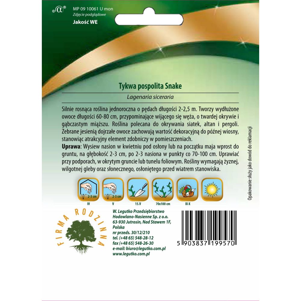 Bujně rostoucí jednoletá rostlina s výhony dlouhými 2-2,5 m. Vytváří podlouhlé plody 60-80 cm dlouhé, připomínající svíjejícího se hada, s tvrdým obalem a houbovitou dužinou. Rostlina se doporučuje pro zakrytí sítí, altánů a pergol. Zralé plody sklizené na podzim si zachovávají svou dekorativní hodnotu až do pozdního jara a tvoří atraktivní dekorativní prvek v místnostech.