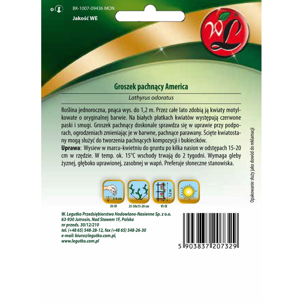 Jednoletá, popínavá rostlina, vysoká až 1,2 m. Po celé léto ji zdobí květy luskovin původní barvy. Na bílých okvětních lístcích jsou červené pruhy a pruhy. Sladký hrách je ideální pro pěstování na podpěrách a plotech a proměňuje je v barevné šplhací zástěny. Řezaná květenství lze použít k vytvoření vonných kompozic a kytic.
