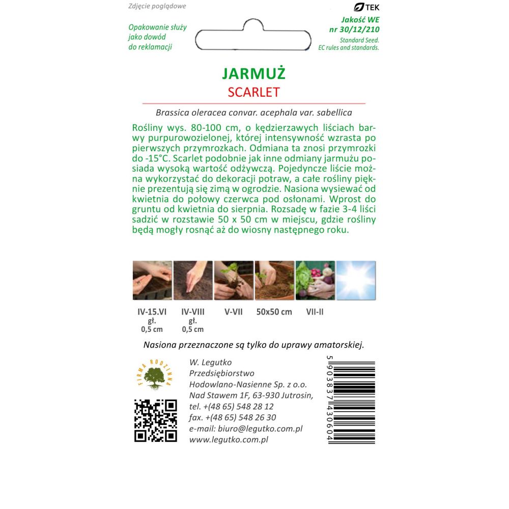 Rostliny 80-100 cm vysoké, s kadeřavými purpurově zelenými listy, jejichž intenzita se zvyšuje po prvním mrazu. Tato odrůda snáší mrazy až do -15 stupňů C. Šarlatová má stejně jako ostatní odrůdy kelu vysokou nutriční hodnotu. Jednotlivé listy lze použít k ozdobení pokrmů a celé rostliny vypadají v zimě na zahradě krásně. Semena vysévejte od dubna do poloviny června pod krytem nebo přímo do země, v závislosti na termínu sklizně. Sazenice vysazujte ve fázi 3-4 listů v rozestupu 70x60 cm na místo, kde budou moci rostliny růst až do jara následujícího roku.