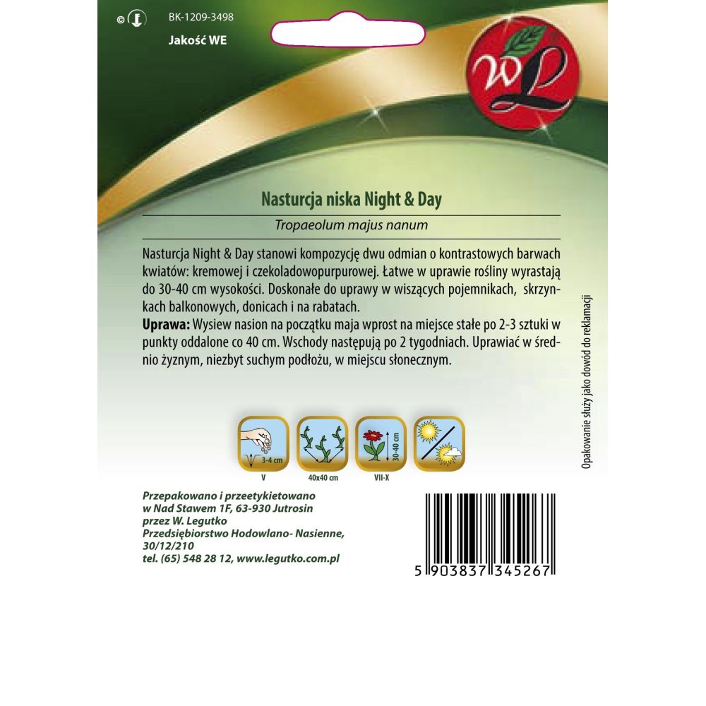 Night&Day nasturtium je kompozice dvou odrůd s kontrastními barvami květů: krémová a čokoládově fialová. Rostliny jsou nenáročné na pěstování, dorůstají do výšky 30-40 cm. Ideální pro pěstování v závěsných nádobách, balkónových truhlících, květináčích a záhonech. PĚSTOVÁNÍ: Semena vysévejte začátkem května přímo na trvalé stanoviště, 2-3 kusy na vzdálenost 40 cm. Ke vzniku dochází po 2 týdnech. Pěstujte ve středně úrodné, nepříliš suché půdě, na slunném místě.