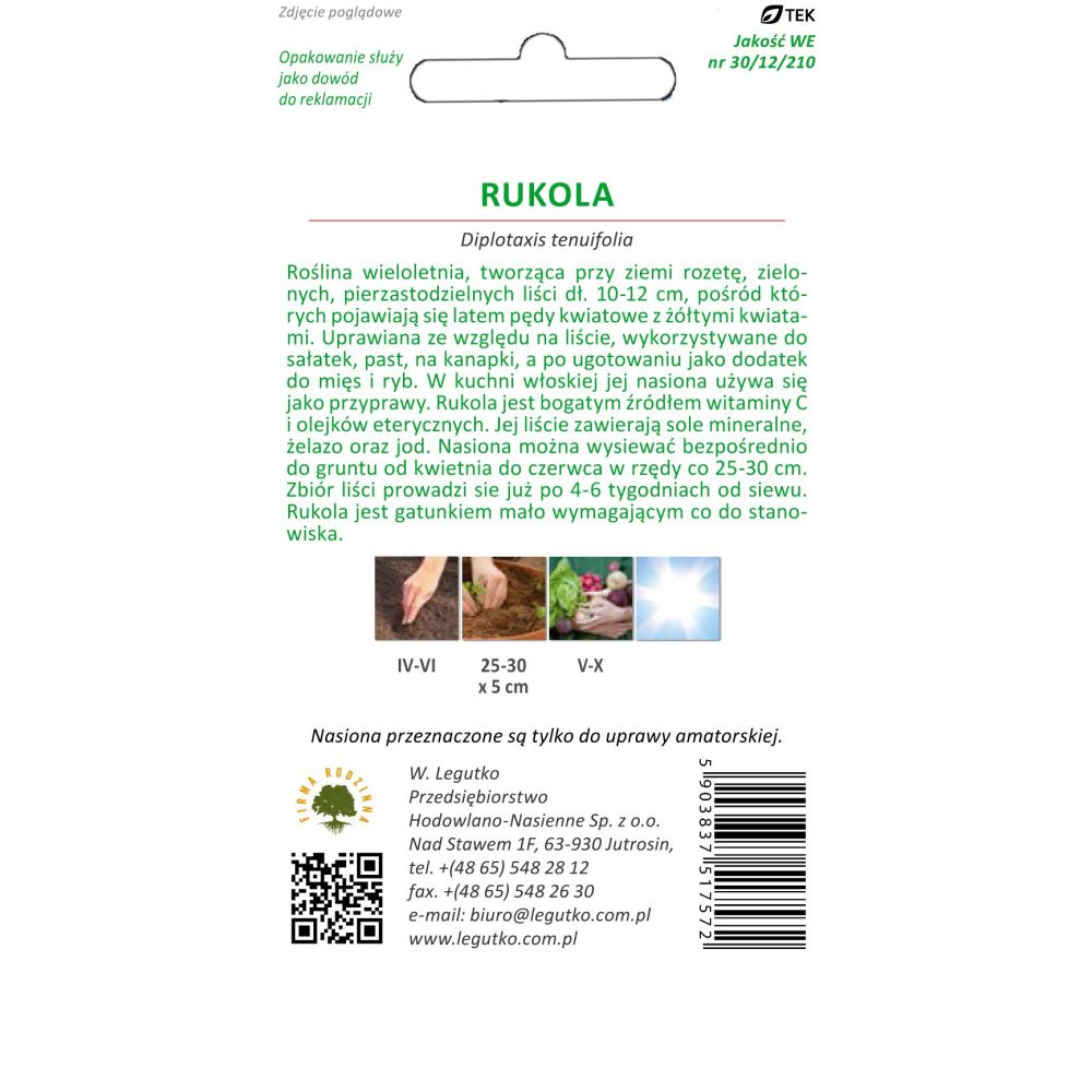 Vytrvalá rostlina, tvořící růžici zelených, u země zpeřených listů, 10-12 cm dlouhé, mezi nimiž se v létě objevují květní výhonky se žlutými květy. Pěstuje se pro své listy, používá se do salátů, pomazánek, sendvičů a po uvaření jako příloha k masu a rybám. V italské kuchyni se jeho semena používají jako koření. Rukola je bohatým zdrojem vitamínu C a esenciálních olejů. Jeho listy obsahují minerální soli, železo a jód. Semena lze vysévat přímo do země od dubna do června do řádků každých 25-30 cm. Listy se sklízejí 4-6 týdnů po výsevu. Rukola je druh nenáročný na svou polohu.