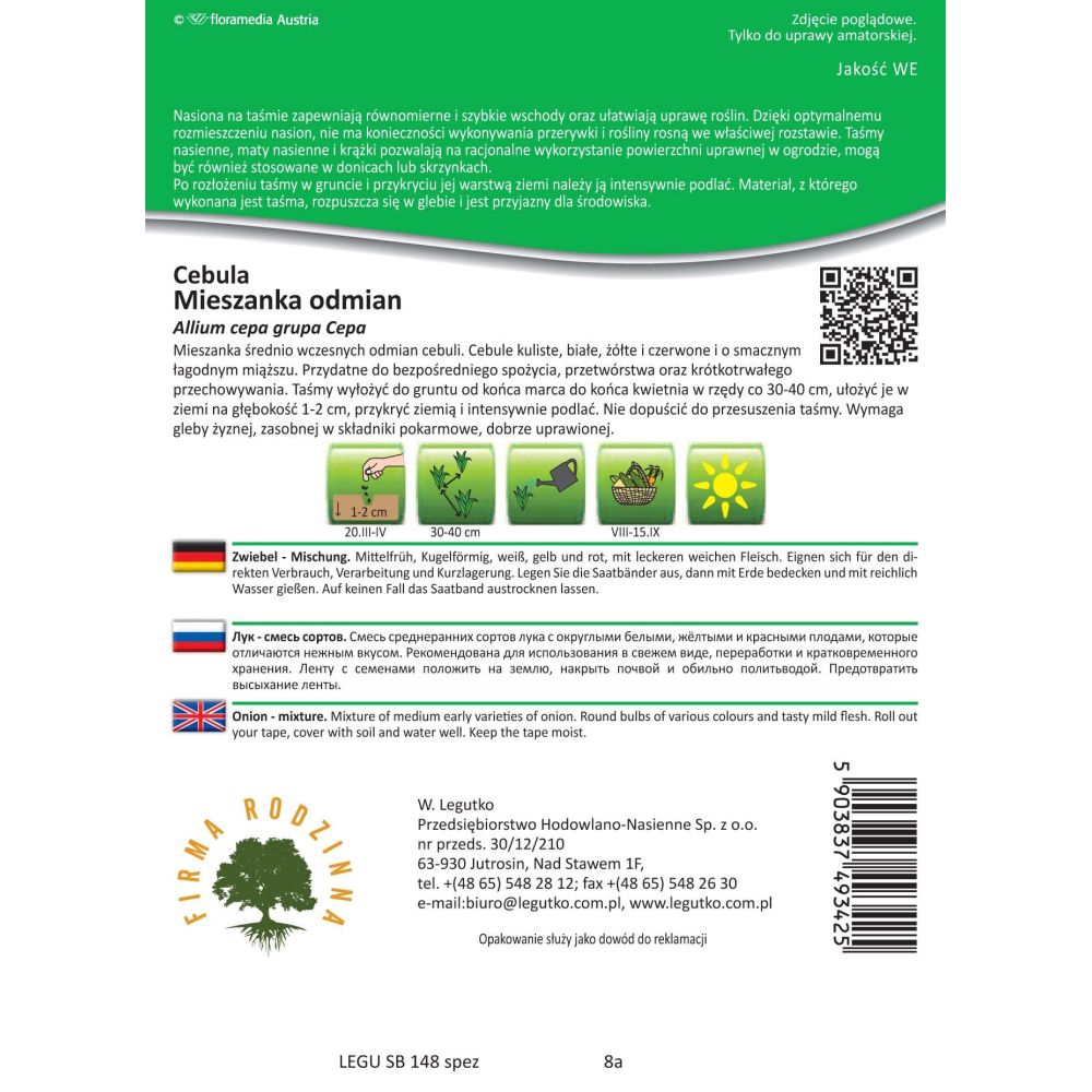 Směs středně raných odrůd cibule. Kulovitá cibule, bílá, žlutá a červená, s chutnou, mírnou dužinou. Vhodné pro přímou spotřebu, zpracování a krátkodobé skladování. Pásy umístěte do země od konce března do konce dubna v řadách každých 30-40 cm, založte je do země do hloubky 1-2 cm, zasypte je zeminou a intenzivně zalévejte. Nenechte pásku zaschnout. Vyžaduje úrodnou, na živiny bohatou, dobře obdělanou půdu.