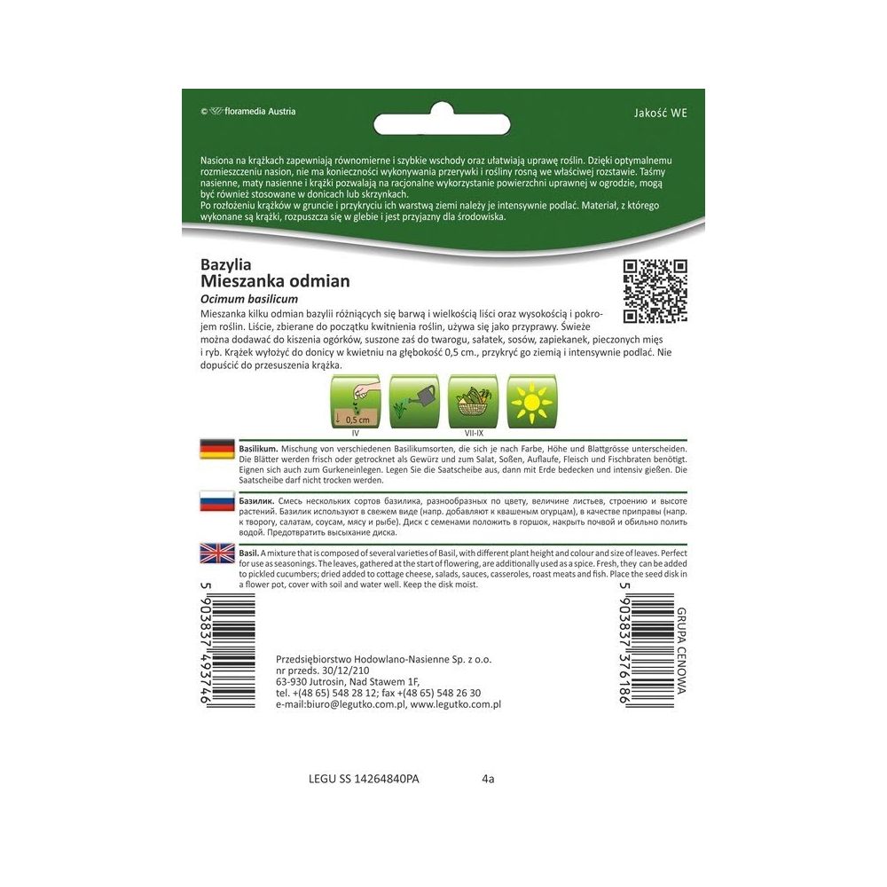 Směs několika odrůd bazalky lišících se barvou a velikostí listů i výškou a tvarem rostlin. Jako koření se používají listy sbírané od začátku květu. Čerstvé lze přidat do nakládaných okurek a sušené do tvarohu, salátů, omáček, kastrolů, pečených mas a ryb. Kotouč umístěte v dubnu do květináčů do hloubky 0,5 cm, zasypte zeminou a intenzivně zalévejte. Nenechávejte disky vyschnout.