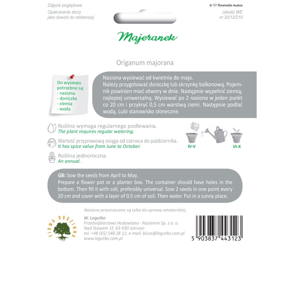 Majoránka je jednoletá rostlina dorůstající do výšky 25-30 cm. Sušené listy se používají ke kořenění polévek, mletého masa, drůbeže, ryb a omáček. Má rád slunné stanoviště.