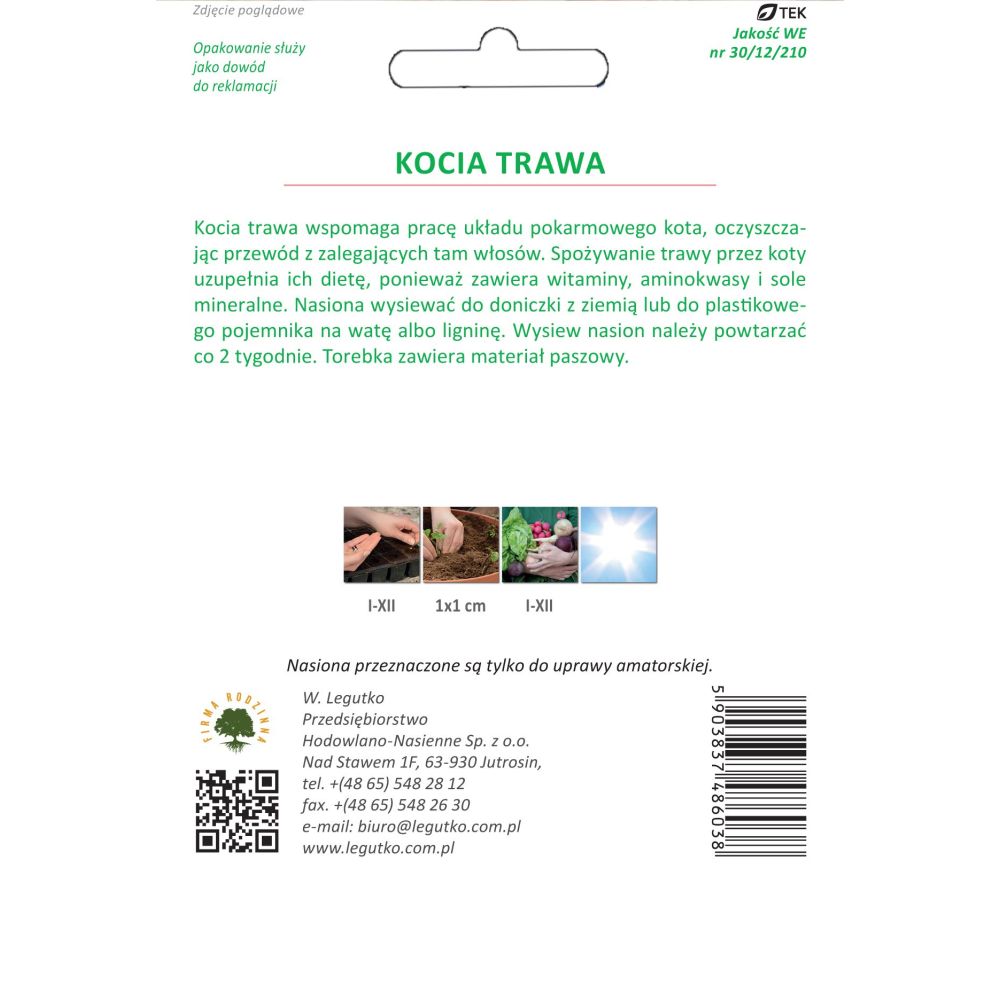 Kočičí tráva podporuje fungování trávicího systému kočky tím, že čistí trakt od chlupů, které tam uvízly. Kočky, které jedí trávu, doplňuje jejich stravu, protože obsahuje vitamíny, aminokyseliny a minerální soli. Semínka zasejte do květináče se zeminou nebo do plastové nádoby naplněné vatou nebo ligninem. Výsev semen by měl být opakován každé 2 týdny. Sáček obsahuje krmný materiál.
