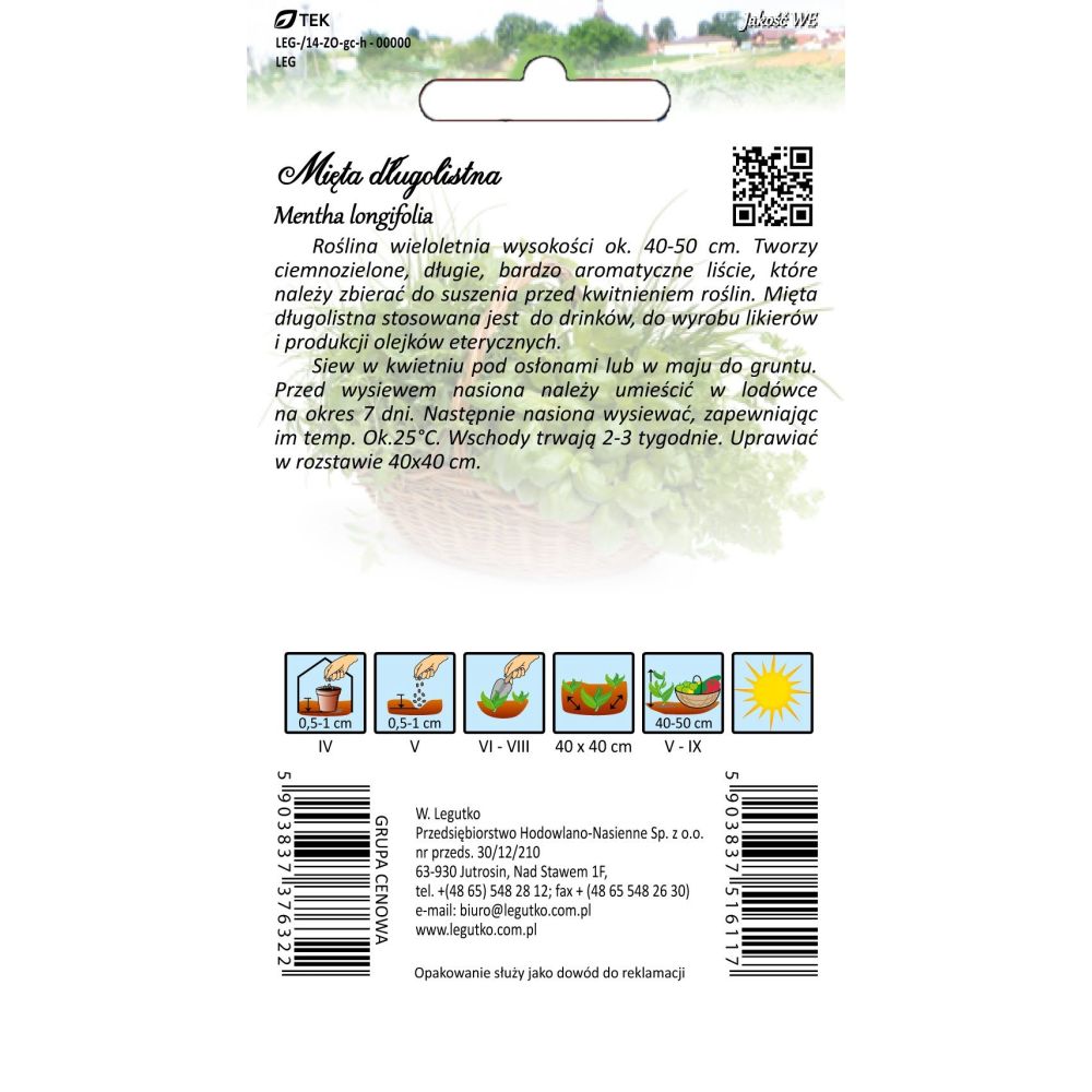 Vytrvalá rostlina, vysoká cca 40-50 cm. Vytváří tmavě zelené, dlouhé, velmi aromatické listy, které by se měly sbírat k sušení před květem rostlin. Máta dlouholistá se používá do nápojů, k výrobě likérů a k výrobě aromatických olejů. Vysévejte v dubnu pod krytem nebo v květnu do země. Před výsevem by měla být semena umístěna v chladničce po dobu 7 dnů. Semena pak vysévejte při teplotě přibližně 25 stupňů C. Vzcházení trvá 2-3 týdny. Roste v rozteči 40x40 cm.