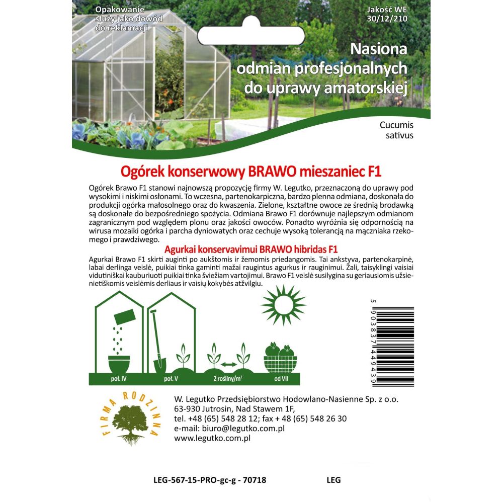 Okurka Brawo F1 je nejnovější nabídkou firmy W. Legutko, určená pro pěstování pod vysokým i nízkým krytem. Jedná se o ranou, partenokarpickou, velmi úrodnou odrůdu, ideální pro produkci nízkosolených okurek a pro nakládání. Zelený, urostlý plod se středně velkou bradavicí se skvěle hodí k přímé konzumaci. Odrůda Brawo F1 se výnosem a kvalitou plodů vyrovná nejlepším zahraničním odrůdám. Kromě toho je odolný vůči viru mozaiky okurky a strupovitosti tykvovité a je vysoce tolerantní vůči peronospoře a padlí.