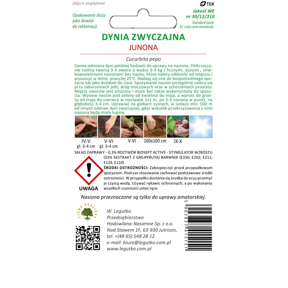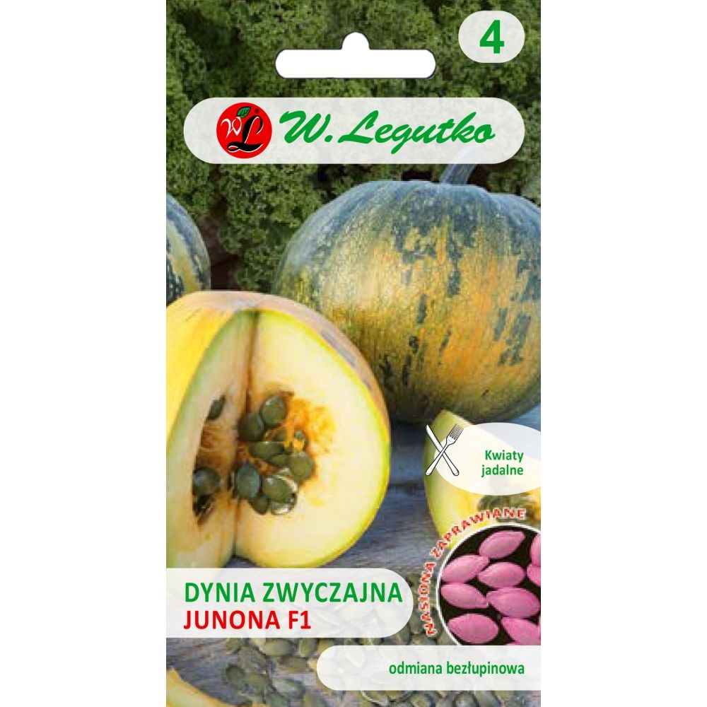 Cenná polská odrůda dýně pro pěstování na semena. Polohuňaté rostliny vytvářejí 3-4 plody o hmotnosti 3-4 kg s četnými velkými, olivově zelenými semeny bez slupek, které je třeba oddělit od dužiny a sušit při teplotách nad 25°C. Jsou vhodné k přímé konzumaci nebo jako příloha do koláčů. Konzumace semen se doporučuje zejména při onemocněních střev a močových cest a onemocnění prostaty. Ovocná dužina je chutná a dá se použít i ke konzumaci. Výsev semen přímo do země v první polovině května ve vzdálenosti 1x1 m, 2-3 semena na bod, v hloubce 3-4 cm. Pěstujte na úrodné půdě, v izolaci, min. 500 m od jiných odrůd dýně, protože v důsledku křížení s nimi budou mít semena skořápku. Pozornost! Semena byla chráněna proti chorobám. Výsev s ochrannými rukavicemi. Datum koření na obalu.