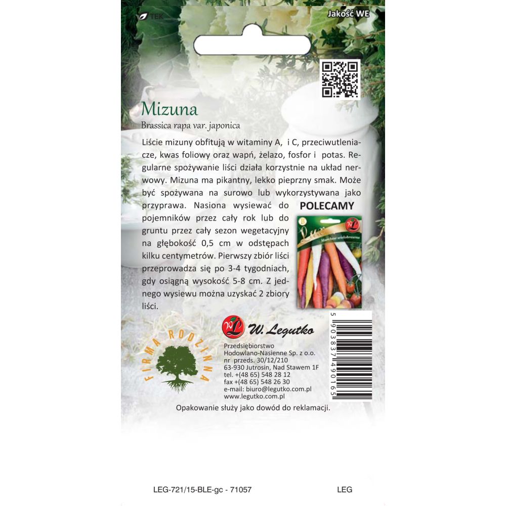 Listy mizuny jsou bohaté na vitamíny A a C, antioxidanty, kyselinu listovou, vápník, železo, fosfor a draslík. Pravidelná konzumace listů příznivě působí na nervovou soustavu. Mizuna má pikantní, lehce pepřovou chuť. Dá se jíst syrové nebo použít jako koření. Semena vysévejte do nádob po celý rok nebo do země během vegetačního období do hloubky 0,5 cm v rozestupech několika centimetrů. První sklizeň listů se provádí po 3-4 týdnech, kdy dosáhnou výšky 5-8 cm. Z jednoho výsevu můžete získat 2 sady listů.