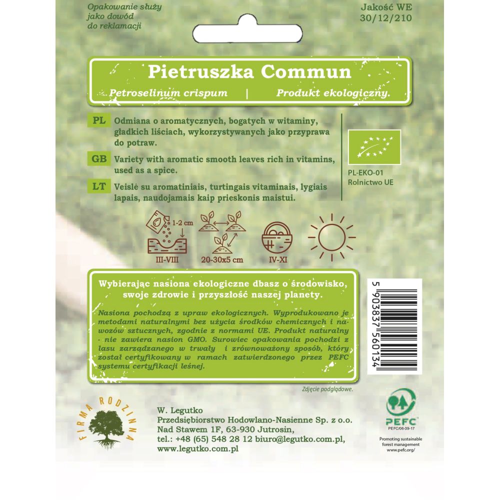 Semena pocházejí z ekologického zemědělství. Byly vyrobeny přírodními metodami bez použití chemikálií a umělých hnojiv, v souladu s normami EU. Přírodní produkt - neobsahuje GMO semena. Balicí papír je vyroben z materiálů z dobře obhospodařovaných lesů s certifikací FSC a dalších kontrolovaných zdrojů.