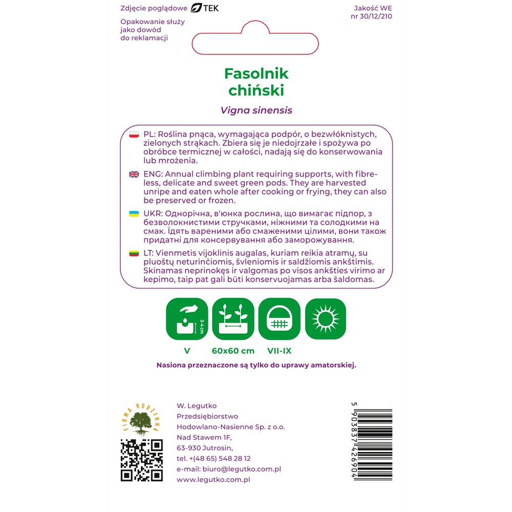 Jednoletá popínavá rostlina, která vyžaduje opory. Jedlá část jsou zelené, tenké lusky, 30-60 cm dlouhé, objevují se od konce července do října. Jsou bez vlákniny a mají jemnější a sladší chuť než zelené fazolové lusky. Sklízí se nezralé a konzumují se vařené nebo smažené celé, jako zeleninové špagety, nebo nakrájené na kousky jako zelené fazolky. Mohou být také konzervované nebo zmrazené. Vzhledem k vysokým teplotním nárokům by se měl vigna pěstovat pod krytem nebo ve volné půdě na slunném místě chráněném před větrem. Semena vysévejte v květnu ve vzdálenosti 60-80 x 40 cm. Lusky se sklízejí od července do prvního mrazu.