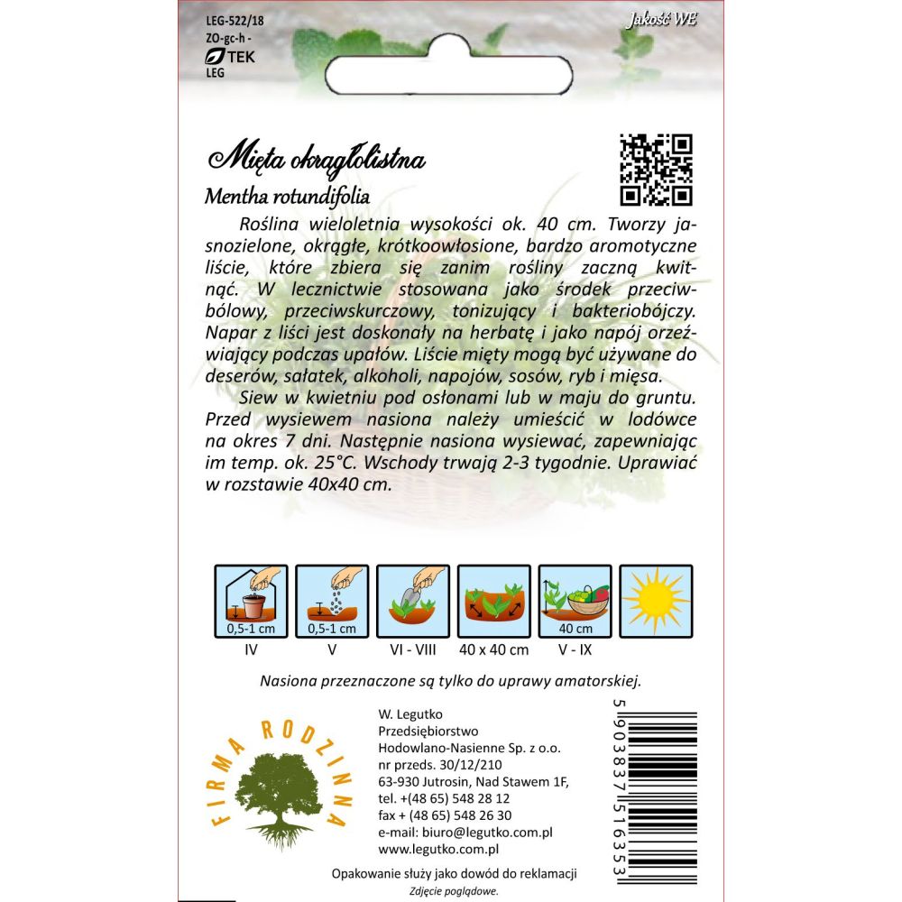 Vytrvalá rostlina vysoká asi 40 cm. Vytváří světle zelené, kulaté, krátkosrsté, velmi aromatické listy. Vysévejte v dubnu pod krytem nebo v květnu do země. Před výsevem by měla být semena umístěna v chladničce po dobu 7 dnů. Semena pak vysévejte při teplotě přibližně 25 stupňů. Vzcházení trvá 2 - 3 týdny.