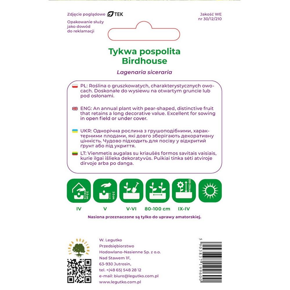 Jednoletá rostlina s 2-2,5 m dlouhými výhony, vytvářející plody hruškovitého tvaru se zúžením v horní části. Tvar plodu připomíná hnízdní budku pro ptáky. Zralé plody sklizené na podzim si zachovávají svou dekorativní hodnotu až do pozdního jara a tvoří atraktivní dekorativní prvek v místnostech. Semena vysévejte v dubnu, nejlépe pod kryty, do květináčů o průměru 8-10 cm, nebo začátkem května přímo na trvalé místo, do hloubky 2-3 cm, 2-3 semínka na místo. Pěstujte v blízkosti podpěr, ve volné půdě nebo ve fóliovém tunelu ve vzdálenosti 80-10 cm. Rostliny vyžadují úrodnou, teplou, vlhkou půdu a slunné stanoviště chráněné před větrem.