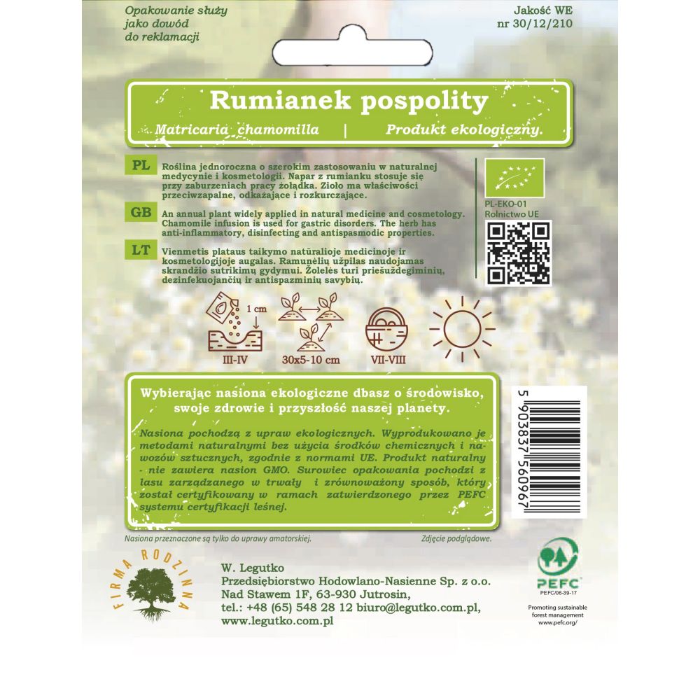 Semena pocházejí z ekologického zemědělství. Byly vyrobeny přírodními metodami bez použití chemikálií a umělých hnojiv, v souladu s normami EU. Přírodní produkt - neobsahuje GMO semena. Balicí papír je vyroben z materiálů z dobře obhospodařovaných lesů s certifikací FSC a dalších kontrolovaných zdrojů.