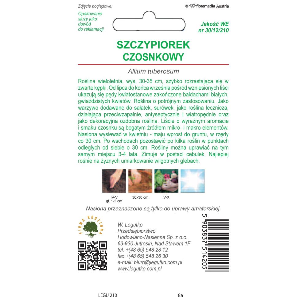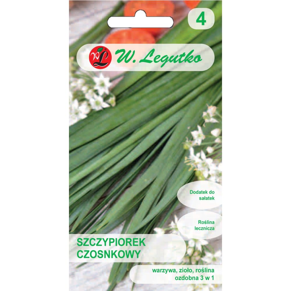 Vytrvalá rostlina, 30-35 cm vysoká, rychle rostoucí do kompaktních trsů. Mezi vyvýšenými listy se od července do konce září objevují výhony květenství zakončené pupečníky bílých hvězdicovitých květů. Rostlina se třemi způsoby použití. Jako zelenina přidávaná do salátů a salátů, jako léčivá rostlina s protizánětlivými, antiseptickými a karminativními vlastnostmi a jako dekorativní okrasná rostlina. Listy s výraznou vůní a chutí česneku jsou bohatým zdrojem mikro- a makroprvků. Semena vysévejte v dubnu až květnu přímo do země, do řádků každých 30 cm. Po vzejití ponechejte několik rostlin v bodech 30 cm od sebe. Rostliny lze pěstovat na stejném místě po dobu 3-4 let. Zimuje v podobě cibulovin. Nejlépe roste v úrodných, středně vlhkých půdách.