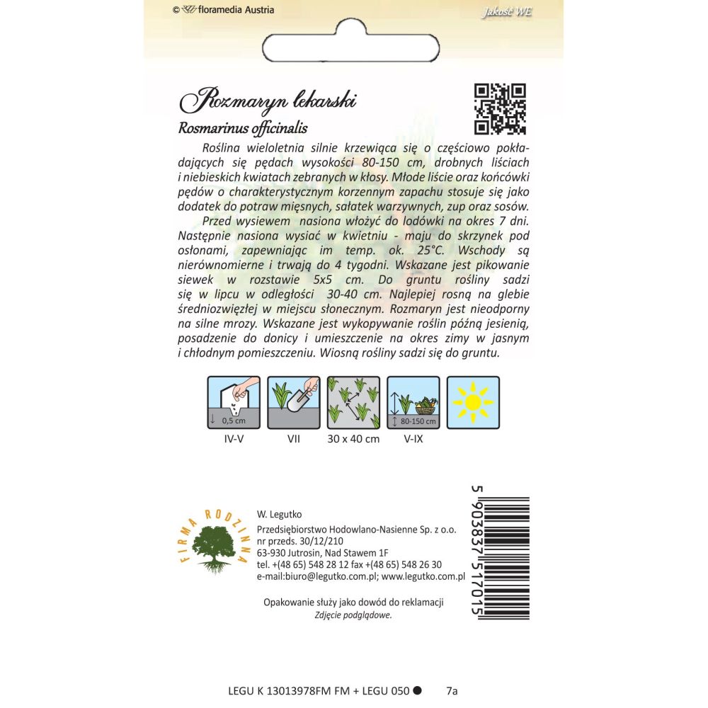 Silně větvená vytrvalá rostlina s částečně vzpřímenými výhony, 80-150 cm vysokými, malými listy a modrými květy shromážděnými v klasech. Mladé listy a výhonky s charakteristickou kořeněnou vůní se používají jako přísada do masitých pokrmů, zeleninových salátů, polévek a omáček. Před výsevem dejte semena na 7 dní do lednice. Semena pak vysévejte v dubnu až květnu do krabic pod kryty, které jim zajistí teplotu přibližně 25 stupňů Celsia. Vzcházení je nerovnoměrné a trvá až 4 týdny. Sazenice se doporučuje sázet ve vzdálenosti 5x5 cm. Rostliny se vysazují do země v červenci na vzdálenost 30-40 cm. Nejlépe rostou ve středně husté půdě na slunném místě. Rozmarýn není odolný vůči silným mrazům. Rostliny se doporučuje koncem podzimu vyrýt, zasadit do květináče a na zimu umístit do světlé a chladné místnosti. Na jaře se rostliny zasadí do země.