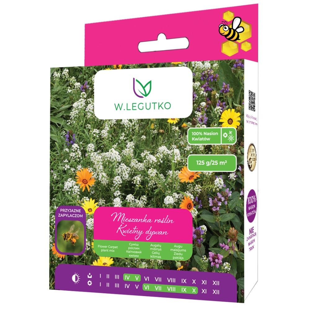 Kompaktní koberec z nízkých, vícebarevných jednoletých a víceletých rostlin zpestří prostor vaší zahrady a navíc obohatí biodiverzitu okolí. Tato směs bude perfektní pro nízké záhony, květinové záhony, obruby, zejména v naturalistických prostředích. Rostliny použité ve směsi jsou nenáročné na péči. Semena vysévejte do vysílání od poloviny dubna nebo května na slunné nebo polostinné stanoviště. Směs lze pěstovat na jakékoli půdě, pokud je dobře připravená. Na konci sezóny na podzim rostliny sečeme vytřásáním semen do půdy. Příští rok tak získáme nový květinový koberec.