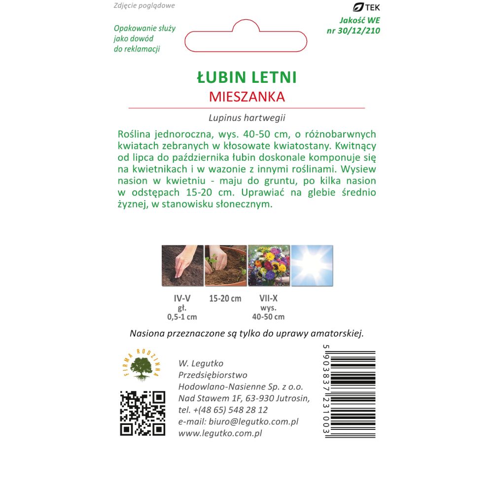 Jednoletá rostlina, 40-50 cm vysoká, s barevnými květy shromážděnými v klasovitých květenstvích. Lupina kvetoucí od července do října se perfektně hodí na záhony a do vázy s jinými rostlinami. Semena zasejte v dubnu až květnu do země, několik semen v rozestupech 15-20 cm. Pěstujte ve středně úrodné půdě, na slunném stanovišti.