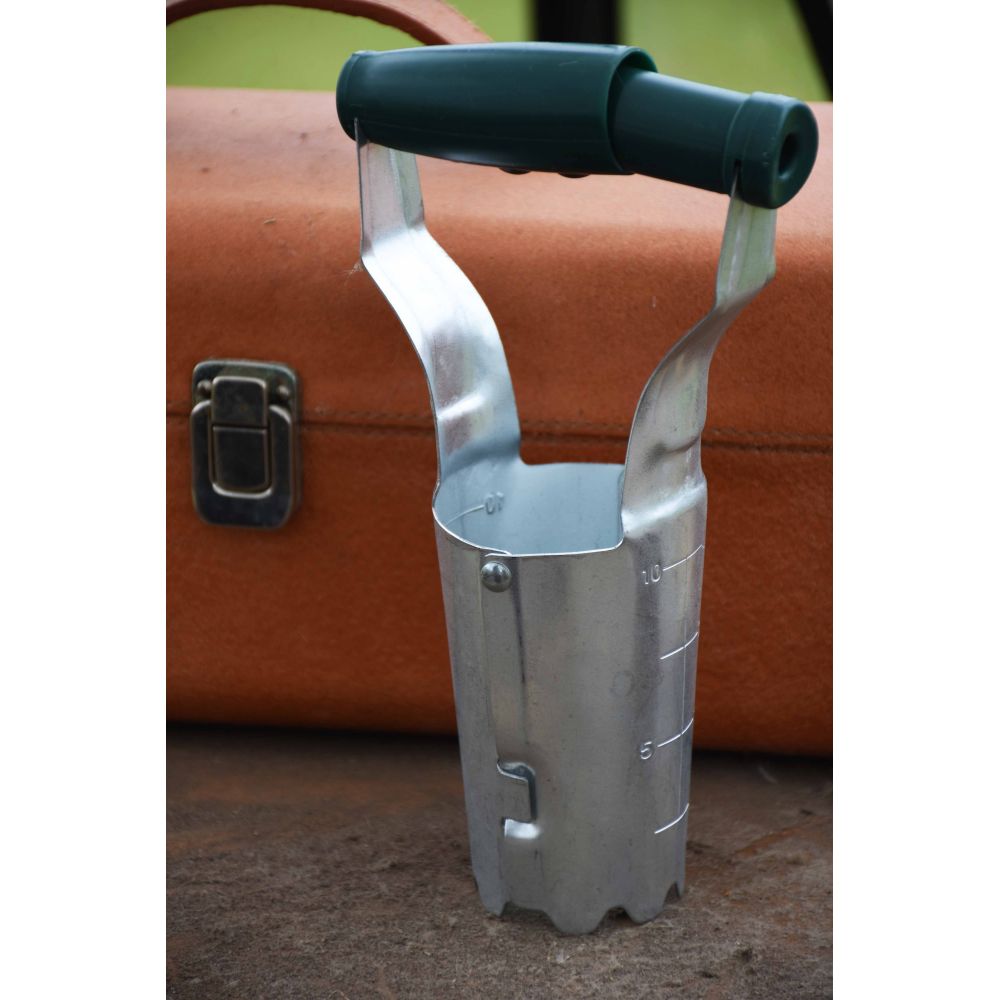 Květináč je vybaven měřícím zařízením umožňujícím vytvořit otvor přizpůsobený velikosti vysazovaných cibulí (nastavitelný až do 10 cm).