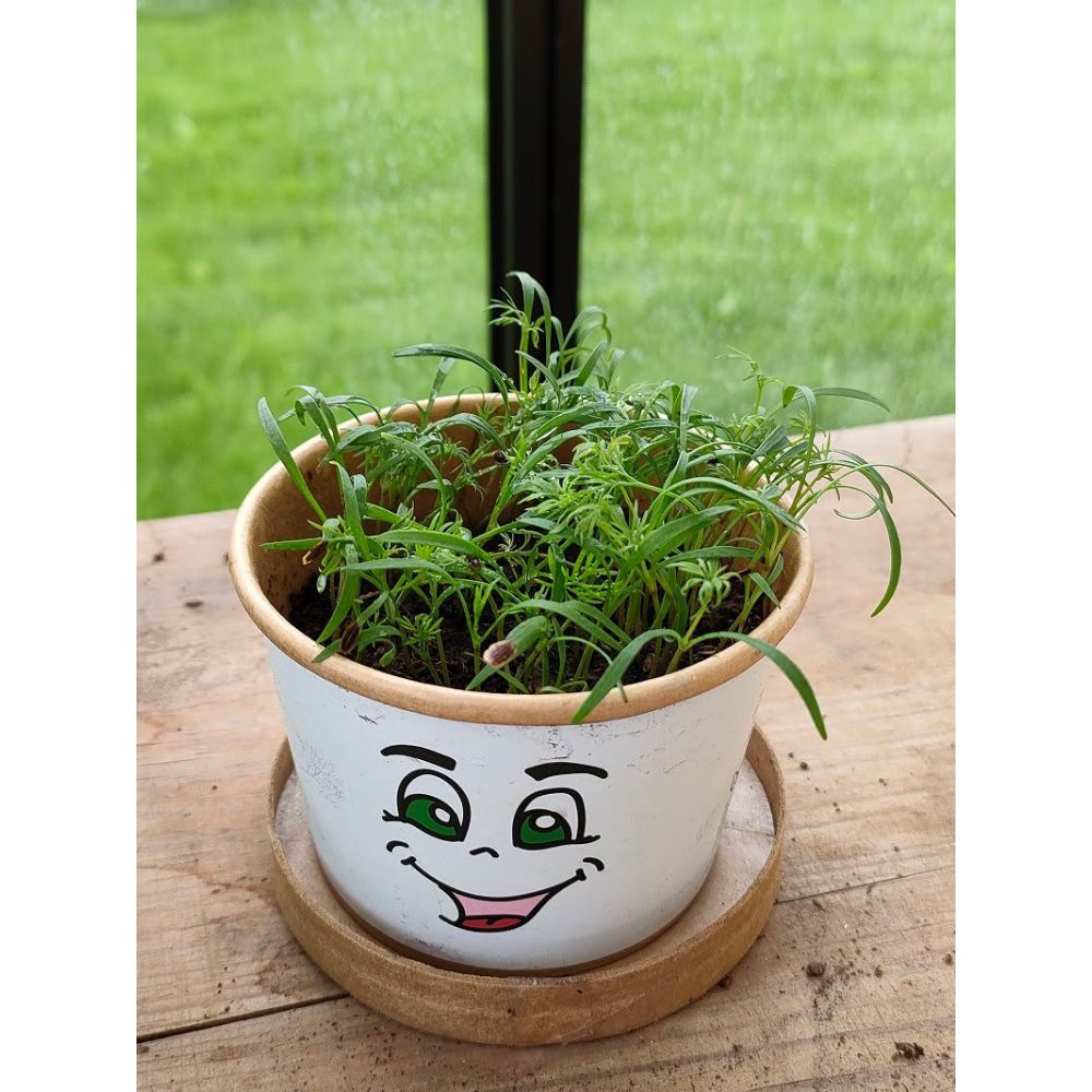 Papírový kelímek se zeminou a semínky je malý, takže si najde místo v každé domácnosti. Přitahuje pozornost svou veselou tváří.